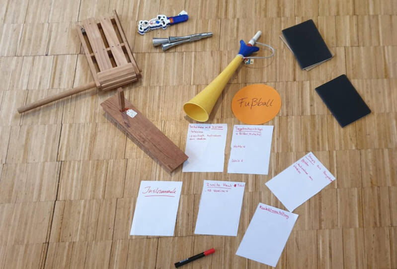 Wir haben uns mit Fangesängen und Hymnen im Fußball beschäftigt. Dabei haben wir viele Fußball-Lieder gehört, uns an unsere eigenen Erlebnisse im Stadion erinnert, ein Interview mit dem Musikethnologen Keivan in Teheran geführt, der zu Fußball-Fangesängen im Iran forscht und Instrumente aus den Sammlungen des CWM herausgesucht, die dabei eine Rolle spielen. Fußball und Fangesänge stiften Identität, daher haben wir ein T-Shirt – als „zweite Haut“ – mit bekannten Vereinen entworfen.
